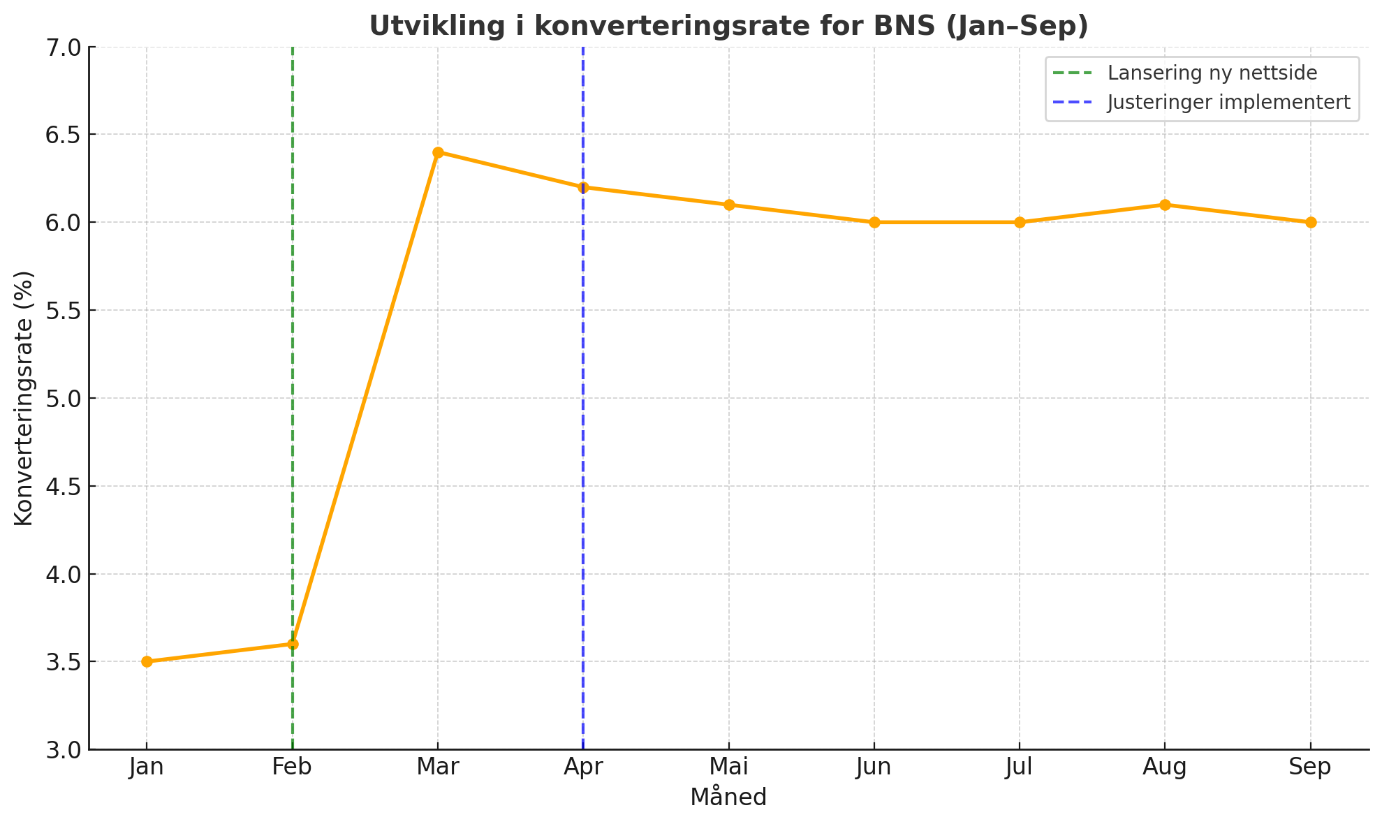 Grafen under viser utviklingen i konverteringsrate fra januar til september. Før lanseringen av ny nettside i februar lå konverteringsfrekvensen på 3,56%. Etter lansering steg den umiddelbart til 6,42%, og etter justeringene i april stabiliserte utviklingen seg rundt 6 %. Totalt har nettsiden oppnådd en 69% høyere konverteringsfrekvens og en reduksjon i fluktfrekvens på hele 49 %.